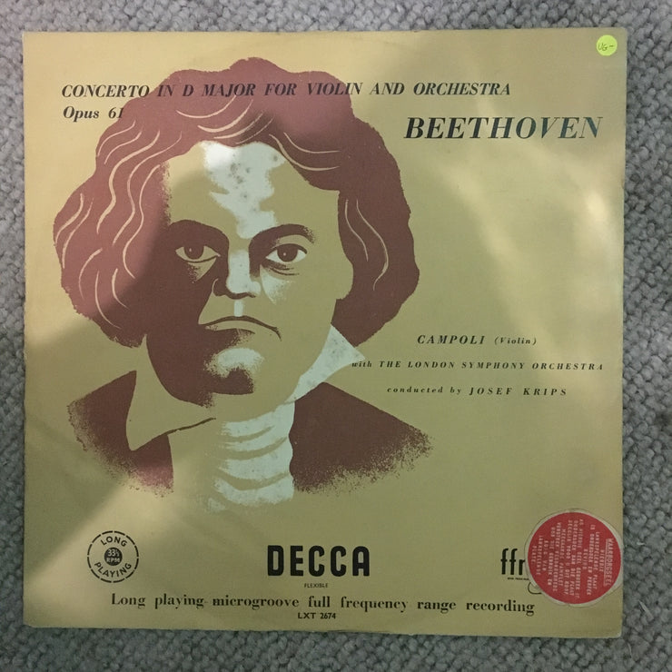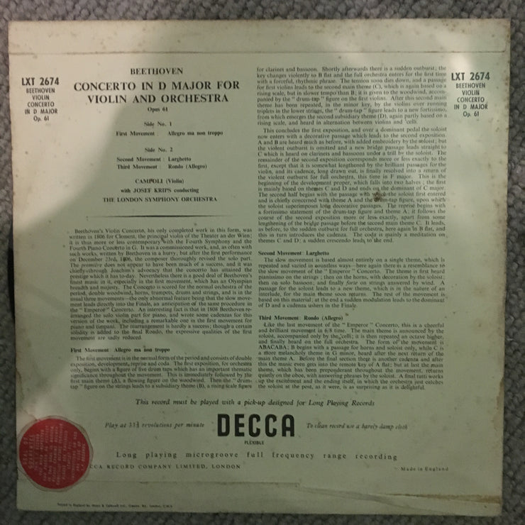 Beethoven - Campoli With The London Symphony Orchestra Conducted By Josef Krips – Concerto In D Major For Violin And Orchestra Opus 61 - Vinyl LP Record - Opened - Very-Good- Quality (VG-)