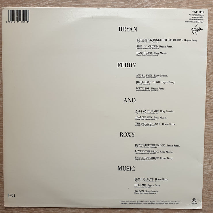 A1 –Bryan Ferry Let's Stick Together ('88 Remix) 2:54 A2 –Bryan Ferry The 'In' Crowd 4:35 A3 –Roxy Music Dance Away 3:44 A4 –Roxy Music Angel Eyes 3:04 A5 –Bryan Ferry He'll Have To Go 4:03 A6 –Bryan Ferry Tokyo Joe 3:55 A7 –Roxy Music All I Want Is You 3:08 A8 –Roxy Music Jealous Guy 6:10 B1 –Bryan Ferry The Price Of Love 3:25 B2 –Bryan Ferry Don't Stop The Dance 4:20 B3 –Roxy Music Love Is The Drug 4:05 B4 –Bryan Ferry This Is Tomorrow 3:38 B5 –Bryan Ferry Slave To Love 4:26 B6 –Bryan Ferry Help Me 4:35 B7 –Roxy Music Avalon 4:12