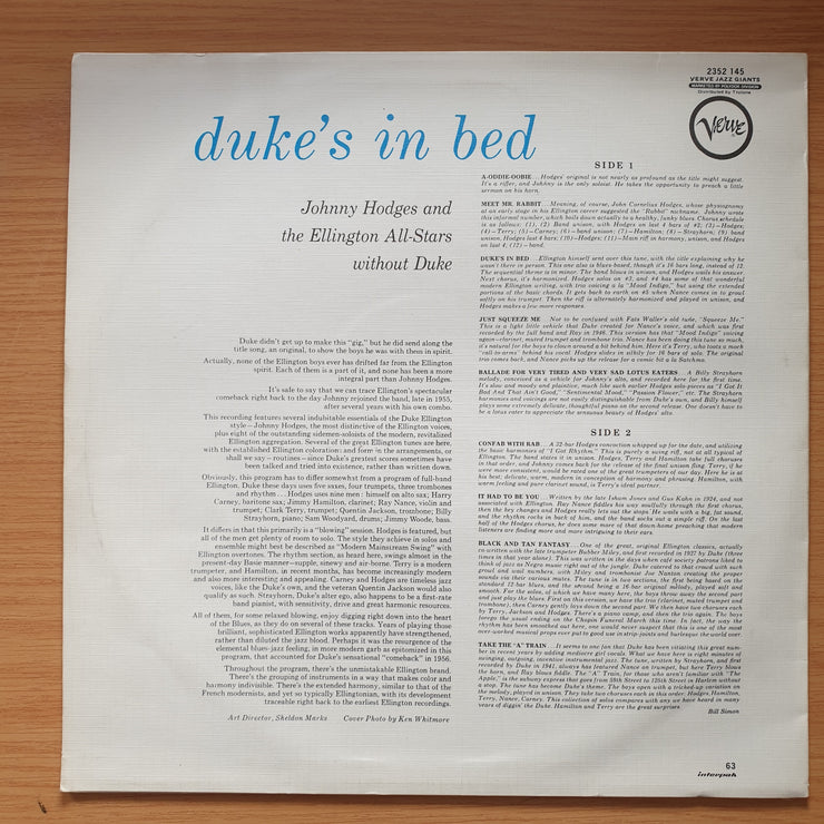 Johnny Hodges And The Ellington All-Stars Without Duke – Duke's In Bed – Vinyl LP Record - Very-Good+ Quality (VG+) (verygoodplus)