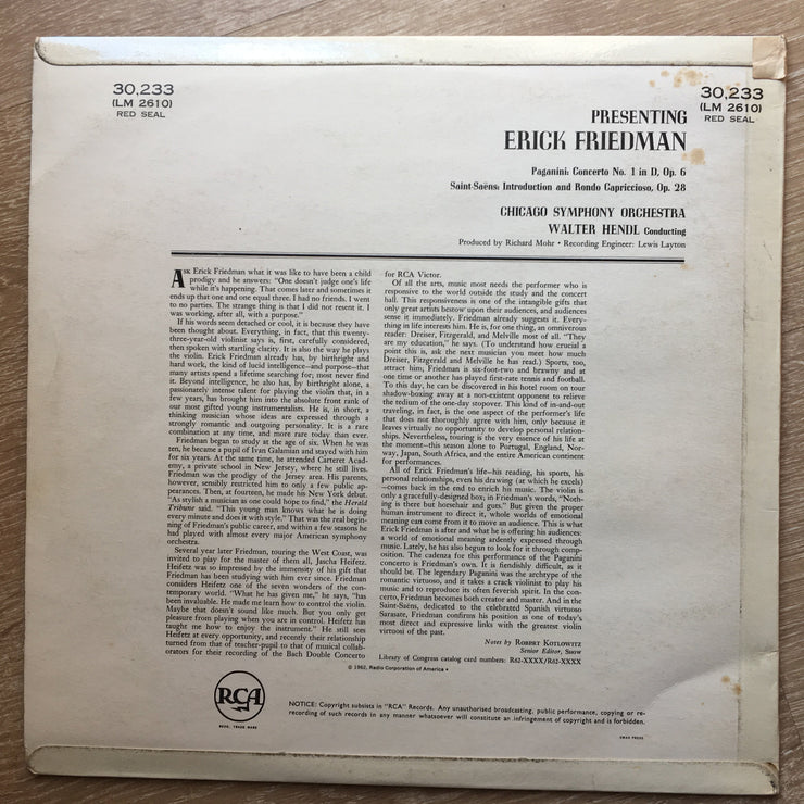 Paganini/ Saint-Saëns - Erick Friedman, Chicago Symphony Orchestra, Walter Hendl – Presenting Erick Friedman - Paganini: Concerto No.1 In D/Saint-Saëns: Introduction And Rondo Capriccioso - Vinyl LP Record - Opened - Very-Good+ Quality (VG+)