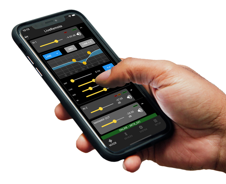 RCF LiveRemote App makes it easy to adjust ART 9-AX mixer, DSP, FX, routing, and Bluetooth® settings. LiveRemote also allows full control of the internal ART 9-AX engine: recall and save presets, set your desired volume levels, adjust EQ, compressors, and FX, customize and tune your sound system and much more. Available for Android and iOS phones and tablets.