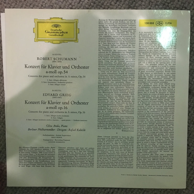Schumann / Grieg - Géza Anda, Rafael Kubelik, Berliner Philharmoniker – Klavierkonzerte In a-moll · Piano Concertos In A minor - Vinyl LP Record - Opened - Very-Good+ Quality (VG+)