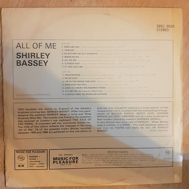 Shirley Bassey - All Of Me - Vinyl LP Record - Opened - Very-Good+ Quality (VG+)